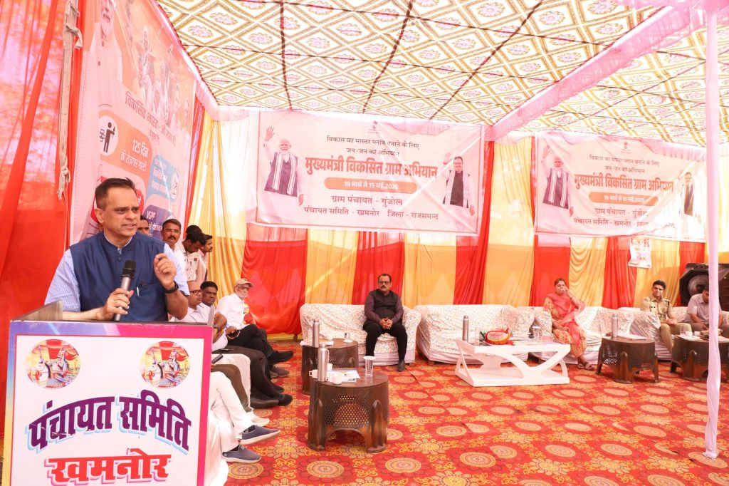 राजसमंद। मुख्य सचिव श्री वी. श्रीनिवास ने शुक्रवार को पंचायत समिति खमनोर की ग्राम पंचायत गुंजोल में मुख्यमंत्री विकसित ग्राम अभियान के अंतर्गत आयोजित ग्राम सभा में भाग लिया। इस अवसर पर उन्होंने ग्रामीणों से सीधा संवाद स्थापित करते हुए केंद्र एवं राज्य सरकार की विभिन्न जनकल्याणकारी योजनाओं की जानकारी प्रदान की तथा अभियान के उद्देश्यों और कार्यप्रणाली पर विस्तार से प्रकाश डाला।